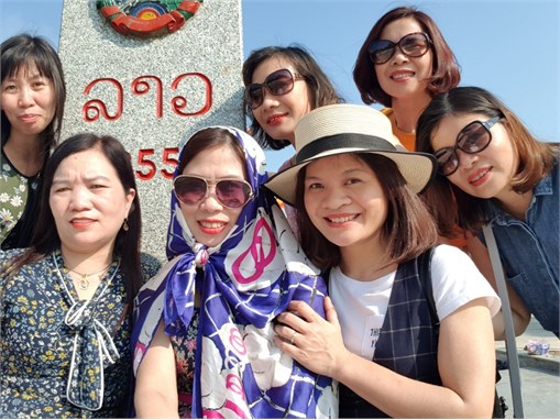 Chị em nữ công chụp ảnh tại cửa cẩu Lóng Sập- Biên giới Lào - Việt