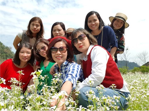 Chị em nữ công chụp tại vườn hoa cải trắng- Bản Thung Cuông-Mộc Châu